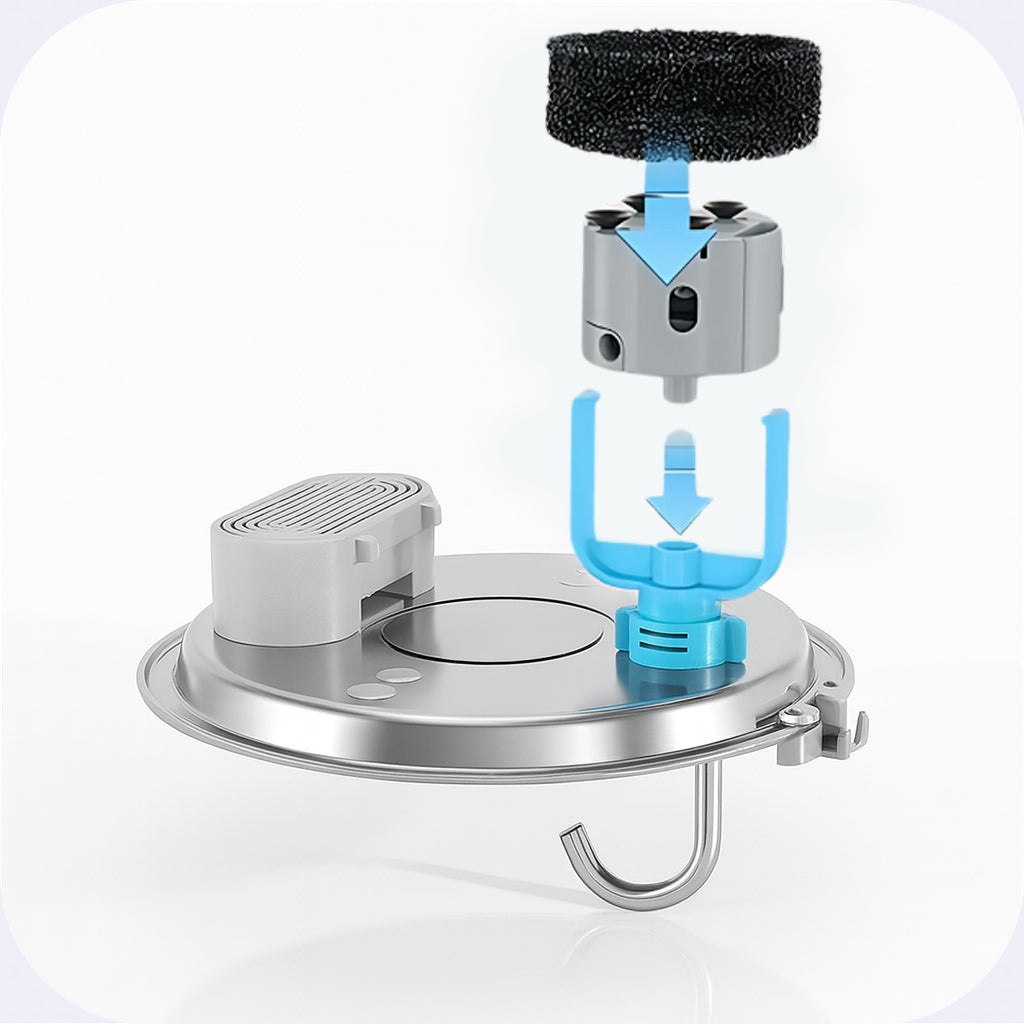- Insert the sponge into the pump holder, place the carbon filter into the filter housing, and close it securely.