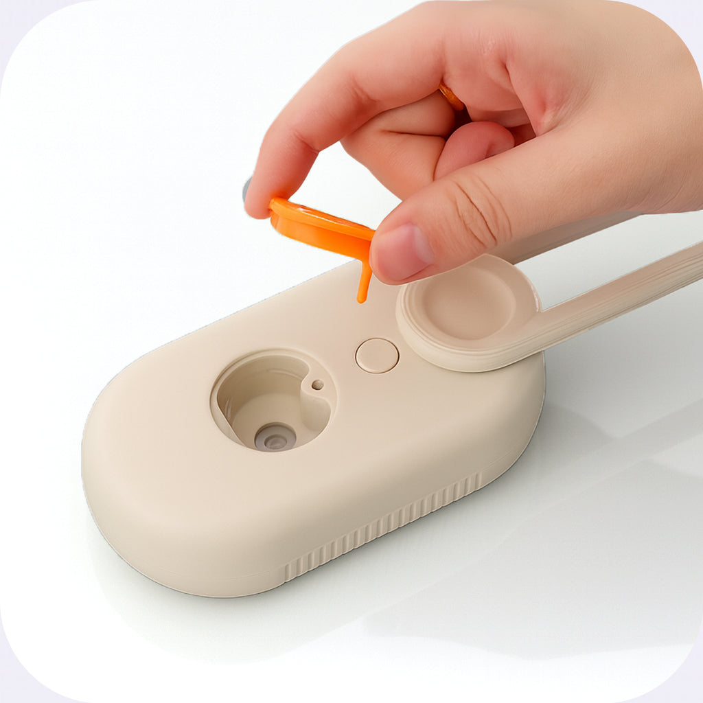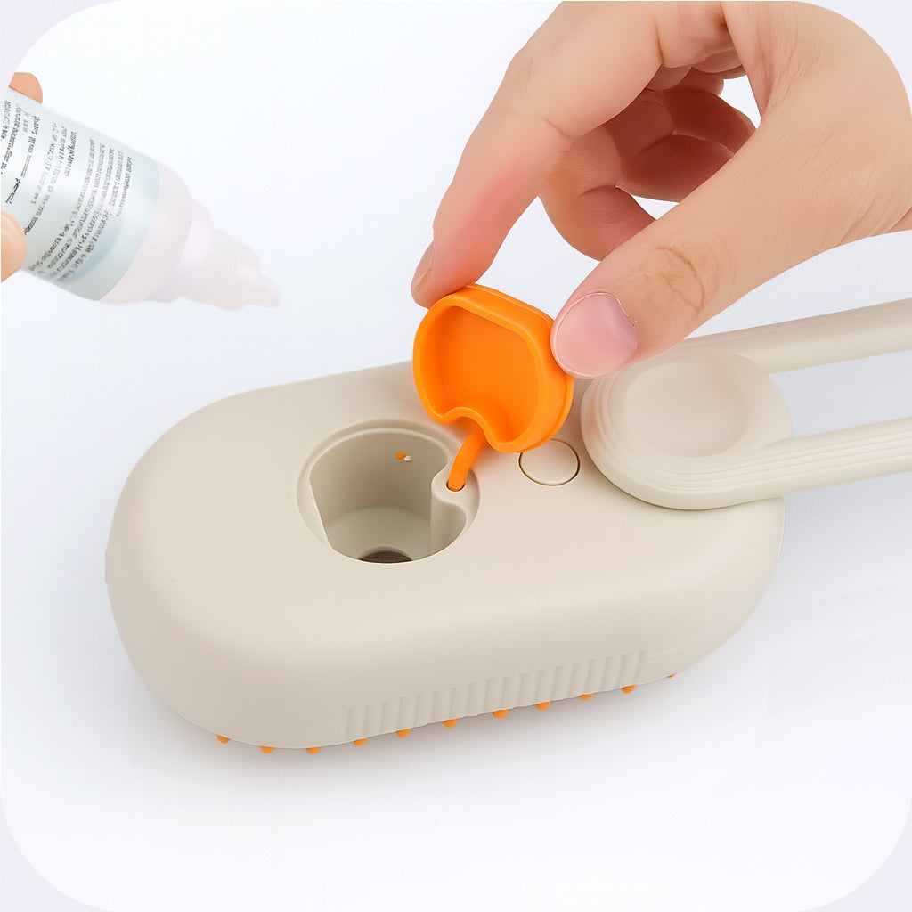 Lift the top lid of the brush to reveal the water inlet. Pour in clean water or your preferred pet-safe grooming essence. Make sure not to overfill the tank, then close the lid securely to prevent leaks.