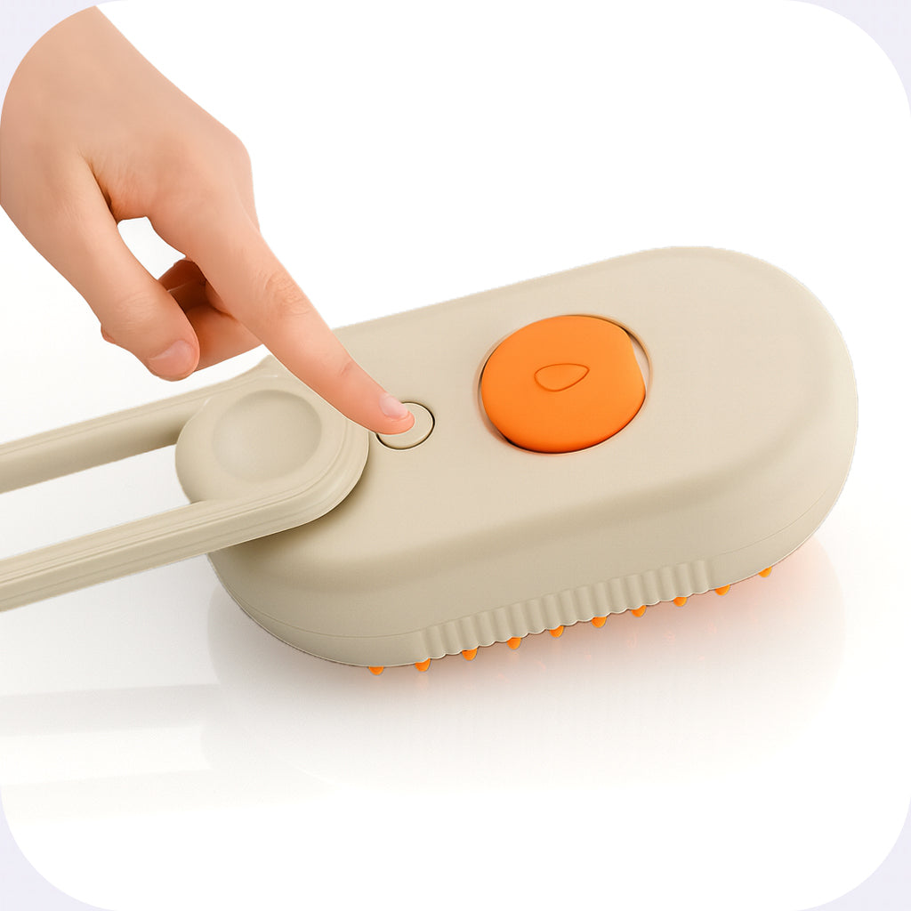 Press the central button once to power on the device. The brush will automatically activate the spray function, releasing a fine mist for a smooth and refreshing grooming experience.